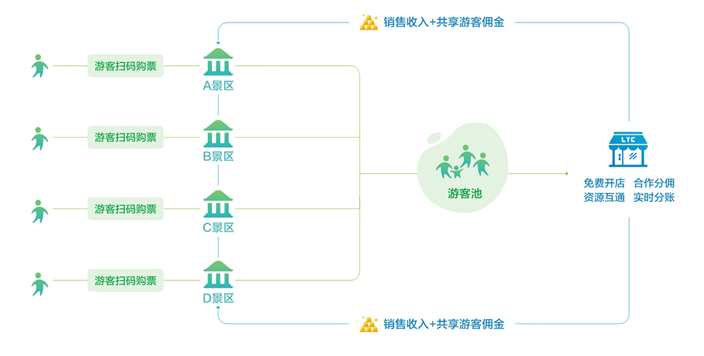 旅游村“實體獲客,共享游客”模式,打破區域限制,通過實體掃碼的方式將景區之間、區域之間孤立的流量島連接起來, 聚集到旅游村游客池,統一進行管理、盤活、刺激、促進二次成交;通過旅游村目的地商城智能推薦客戶消費后,針對共享游客景區進行分傭, 以及針對供應資源景區進行銷售收入結算,實現景區聯合,創造更多營收。