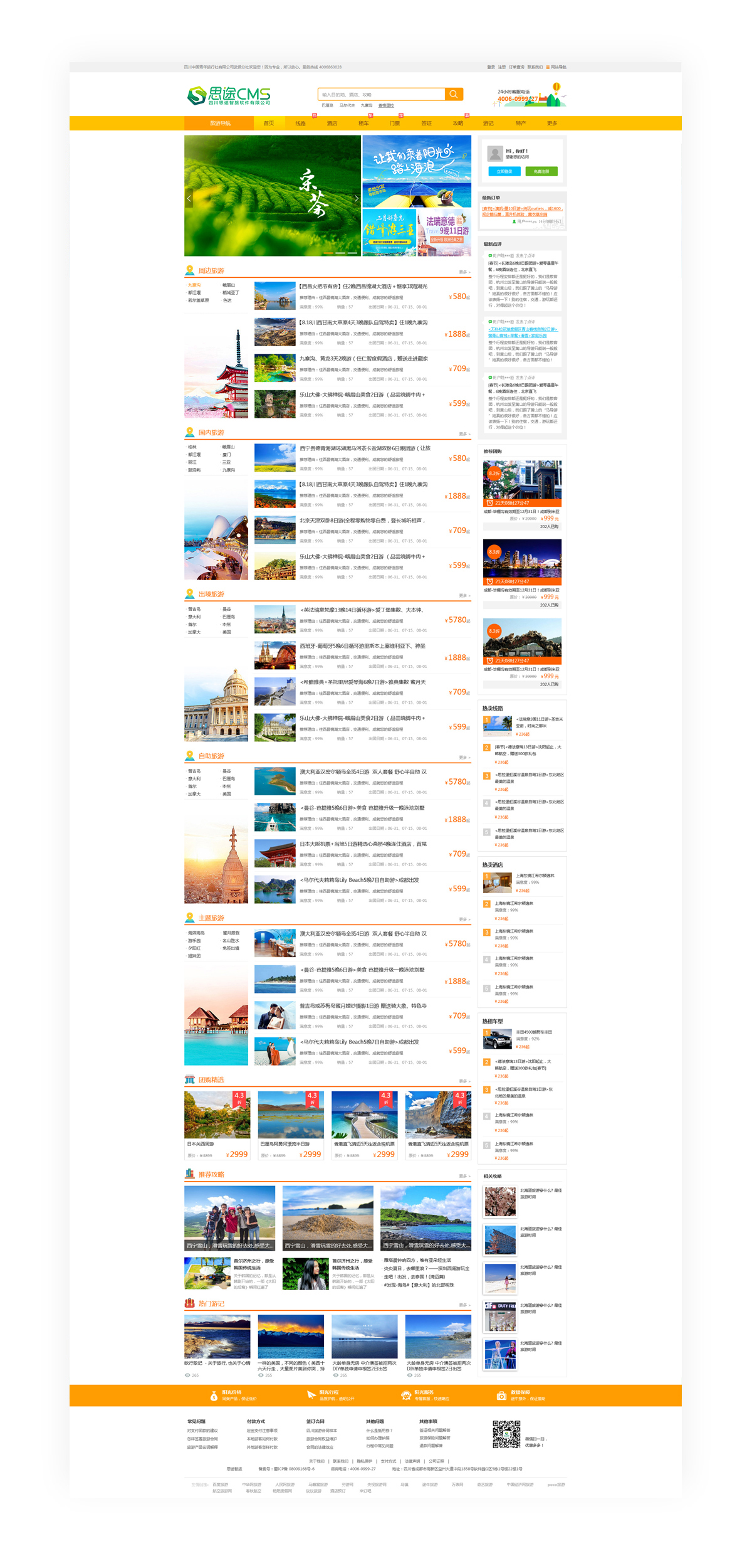 (網站首頁)此模板為官方經典線路首頁模板,首頁可設置豐富旅游線路類型,針對每條線路更可添加多種旅游途經目的地,方便游客定位和篩選。精品旅游線路和熱點推薦線路在首頁集中展示,突出網站業務優勢;重要信息位于網站中心位置,是游客訪問的關注焦點,促進深入了解。配合酒店,租車,團購,游記等業務,一站提供整套旅游出行解決方案。* 該模板不支持二級導航,不支持換膚。