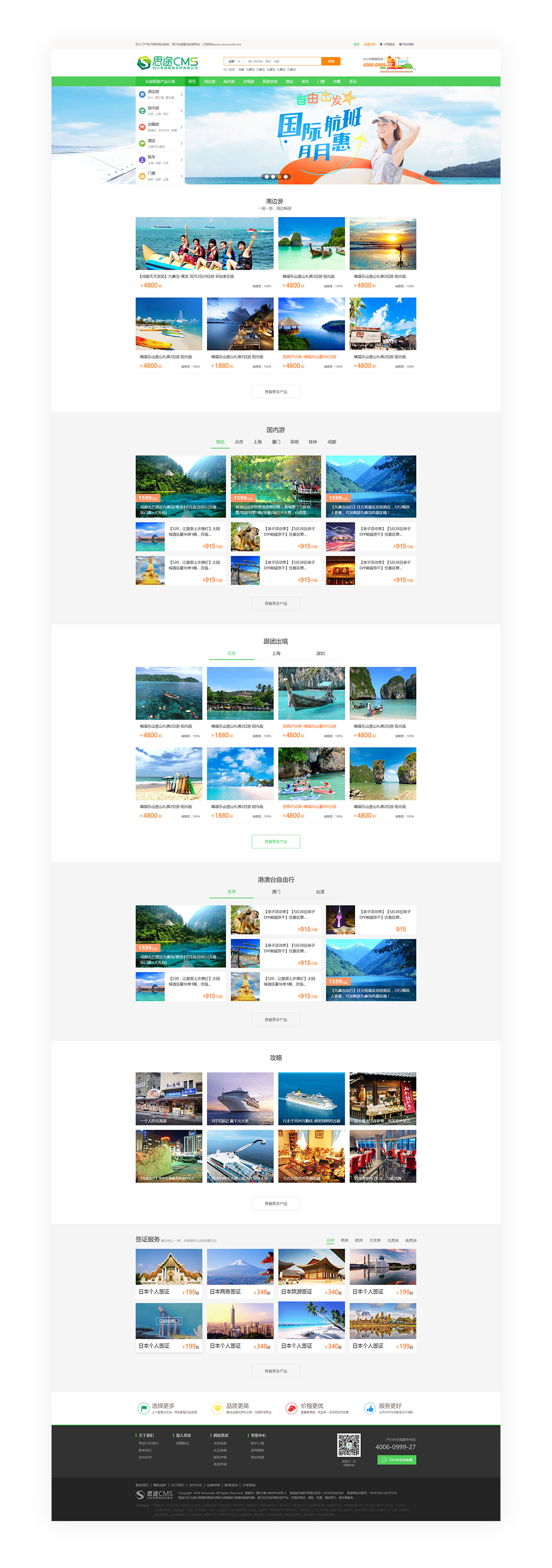 (網站首頁)本套線路首頁模板精致美觀,符合旅游線路網站建設對于時尚設計的需求。網站頁面主題突出,線路以圖片展示為主,相比純文字介紹更加具有吸引力,能夠有效延長游客停留時間。網站設計以時尚為主要元素,符合目前主流審美標準,是一套值得使用的時尚線路首頁模板。* 該模板不支持二級導航,不支持右側模塊。*該模板不支持換膚。
