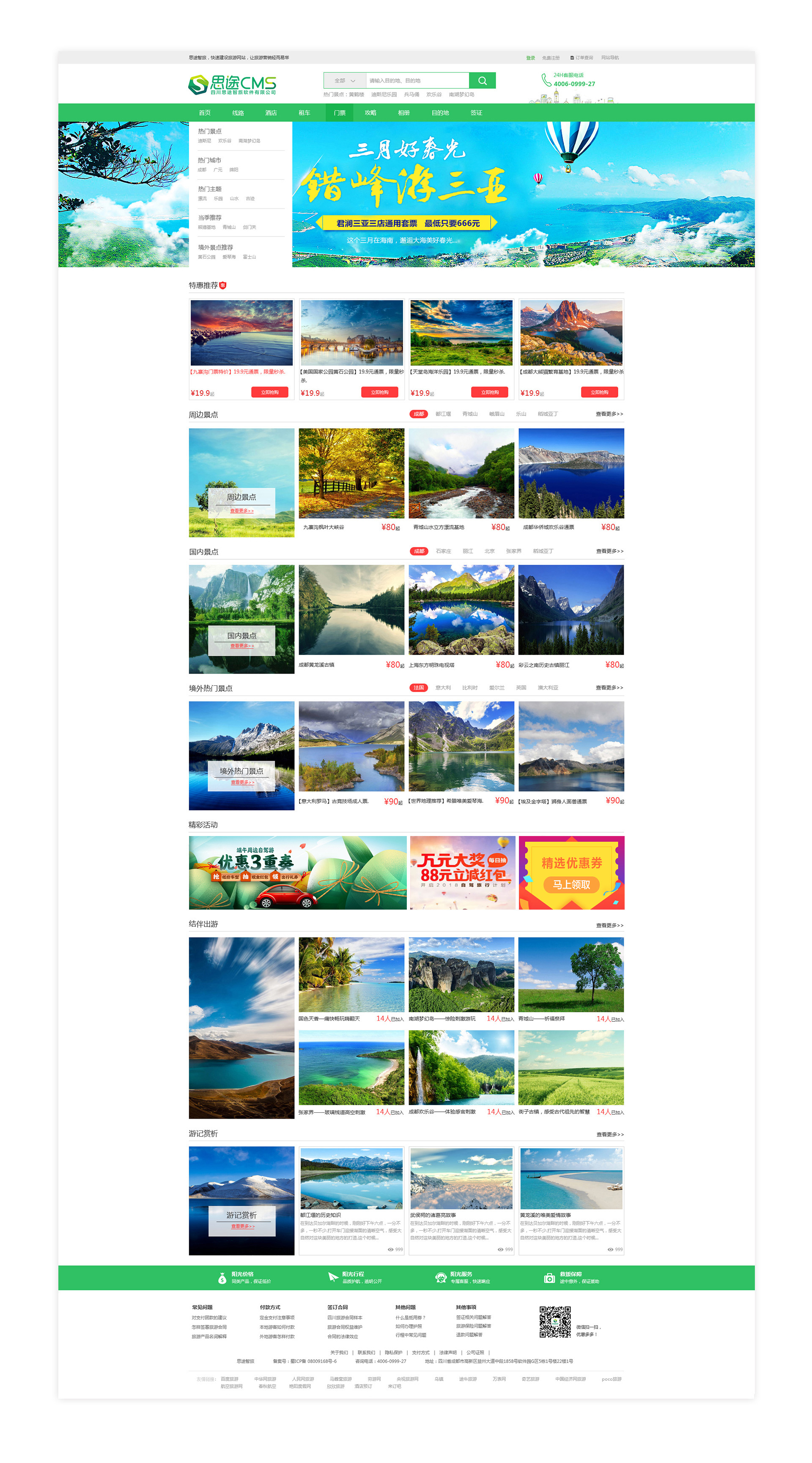 (網站首頁)本套清爽門票首頁模板適合以旅游景區門票為主要業務的旅游網站使用。網站結構清晰,可設置熱門景區進行重點推廣。添加獨立景區和目的地分類,方便游客進行對應篩選。底部廣告位可為網站增添更為豐富的營銷效果。此門票首頁模板,專為旅游景區門票網站打造,非常適合開展景區門票銷售業務。* 該模板不支持二級導航,自定義導航不支持后臺關閉功能,不支持右側模塊。*該模板不支持換膚。
