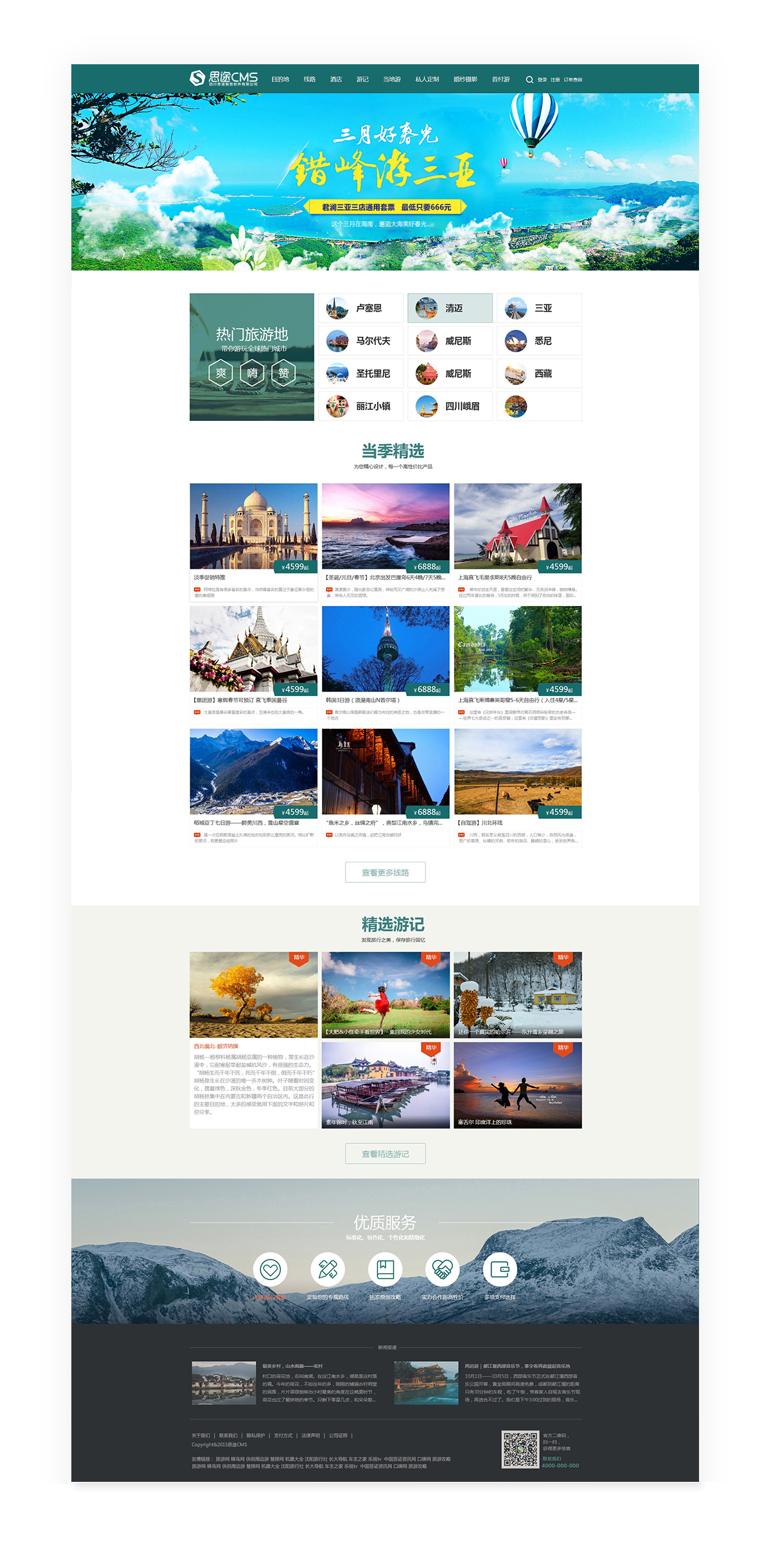 (網站首頁)本套質感美觀線路首頁模板,頁面設計風格美觀大氣,產品陳列清晰,內容豐富,重點突出,具有極強的視覺吸引力。模板可設置目的地,熱門線路和游記,既可推廣產品,又可以增加平臺用戶粘性。使用此套質感美觀線路首頁模板,可為網站產品營銷提供有力的幫助。*該模板不支持換膚。