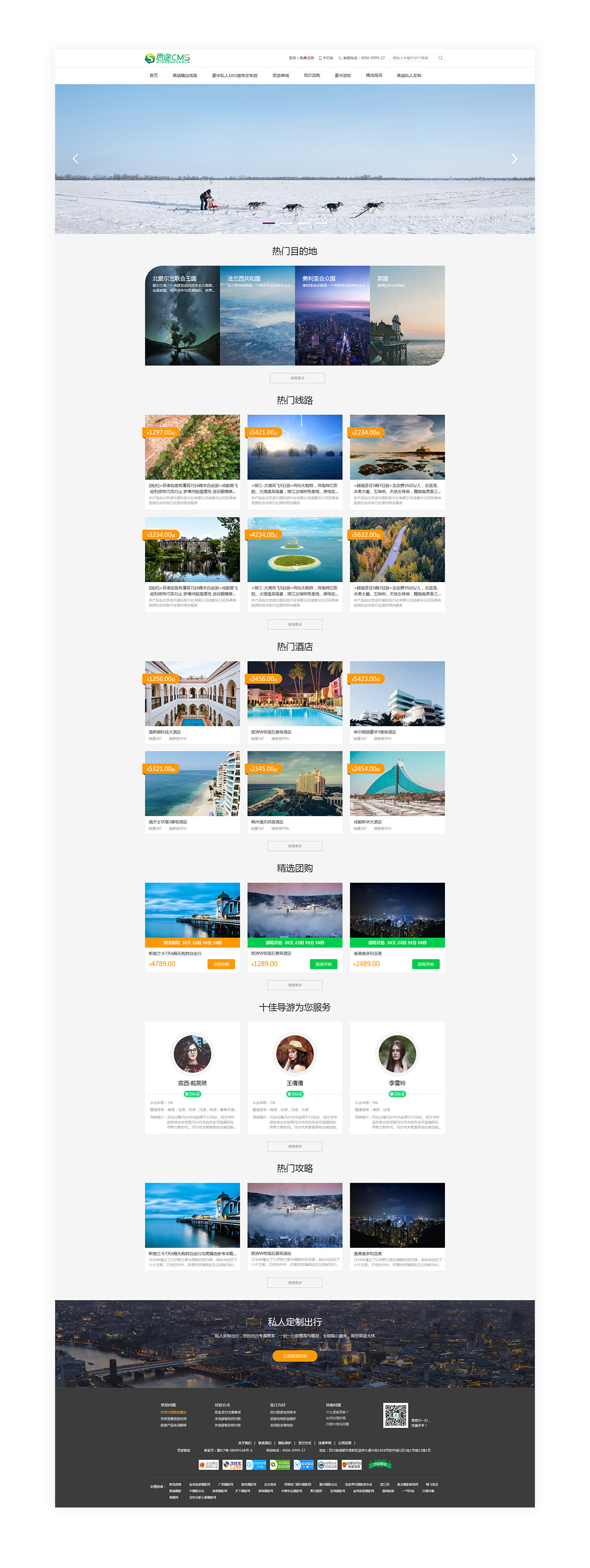 此套模板適合產品類型少的旅游網站建設,比如:單目的地以及私人定制類型產品。網站頂部banner簡潔大氣,突顯網站高端風格。網站首頁呈現形式以圖片為主,具有極強的視覺吸引力。產品特色突顯,增加產品吸引力,有助于提升游客在網站上的停留時間。* 該模板不支持二級導航,不支持自定義導航,不支持右側模塊。該模板不支持換膚。