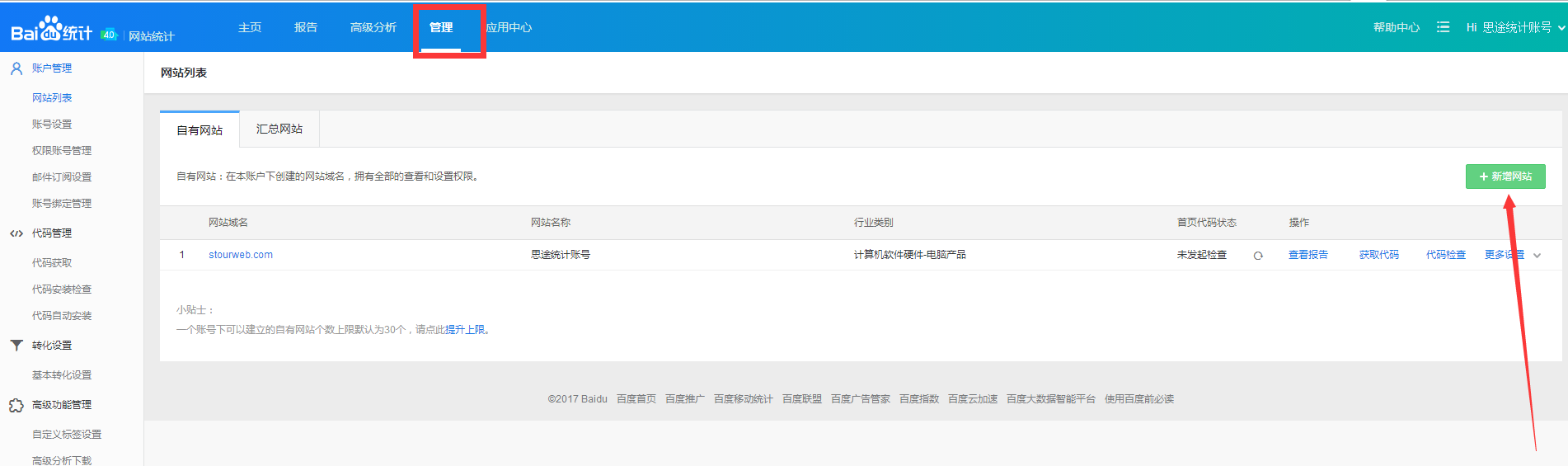 登陸注冊好的統計賬號,點擊管理-》添加網站