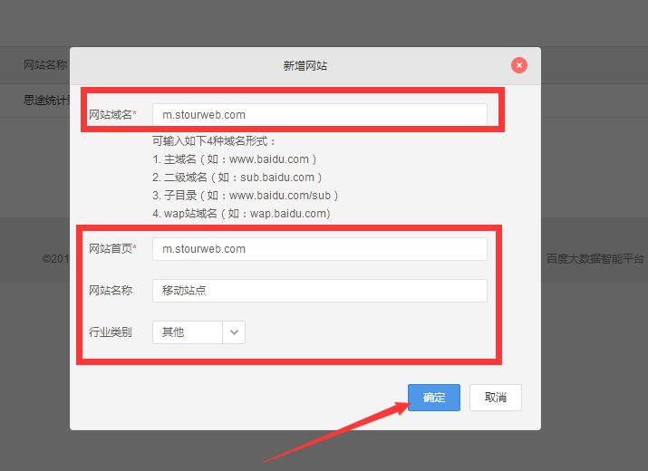 輸入移動站點域名,首頁,網站名稱,點擊確認。