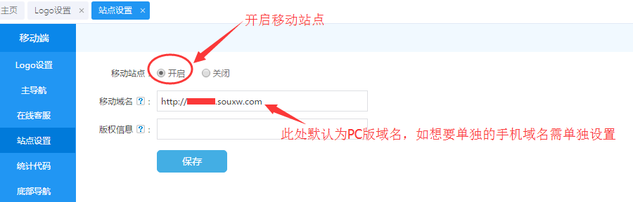 2、在系統后臺開啟移動站點,并設置好移動端域名: