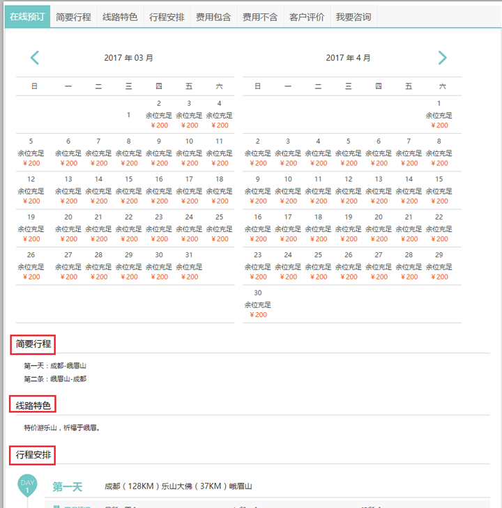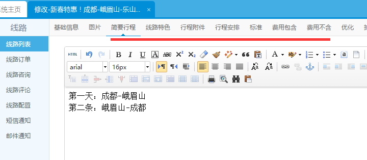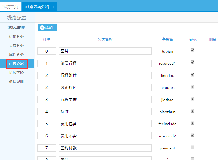3、設置好內容介紹之后,在編輯線路產品時會出現相應的分類,填充完成前臺就會按設置的排序進行展現。