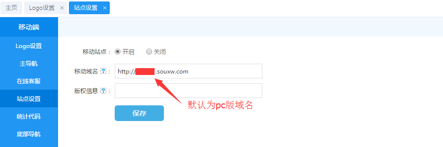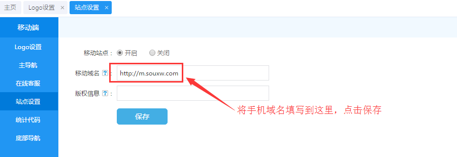 第三步:在后臺站點管理》移動端》站點設置》處綁定域名 :