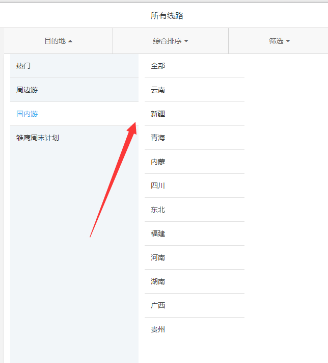 關于手機版的產品篩選頁目的地的顯示設置,以線路產品為例: