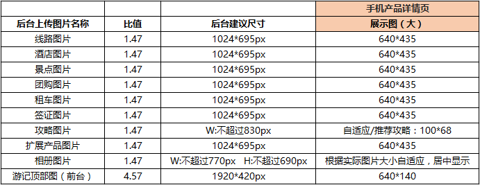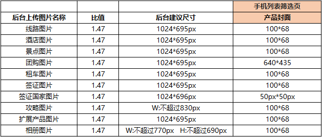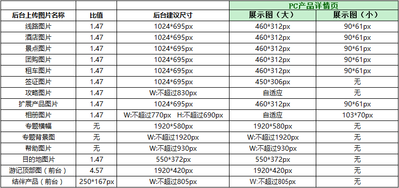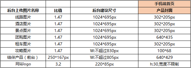 (1)電腦端的圖片上傳建議尺寸與前臺顯示的尺寸列表