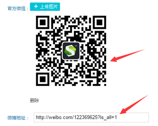 上傳官方微信二維碼的圖片、填寫微博的地址,在前臺客服欄目中可以進行掃描和跳轉