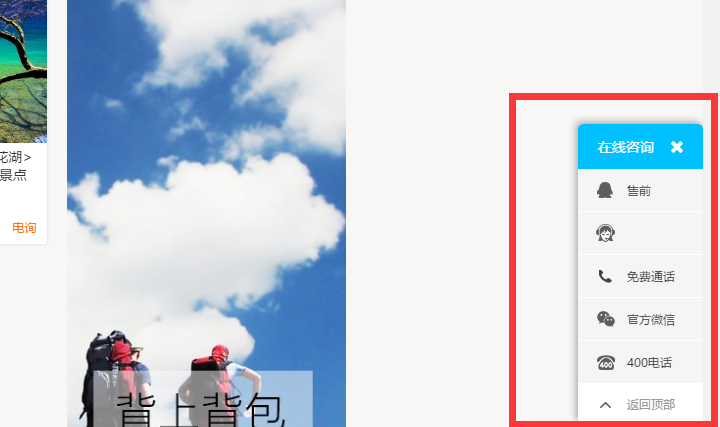 (6)客戶樣式6:支持QQ客服、客服電話、400電話、微信二維碼、官方微博、以及免費電話的顯示,點擊TOP可以 回到頂部