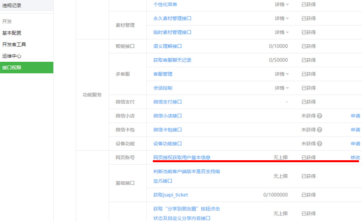 第二步:點擊接口權限,找到網頁授權獲取用戶基本信息進行設置!