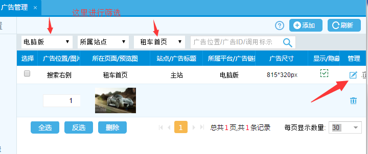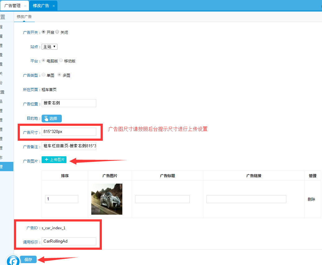 租車首頁搜索右側廣告圖后臺上傳設置:廣告管理-電腦版-租車首頁