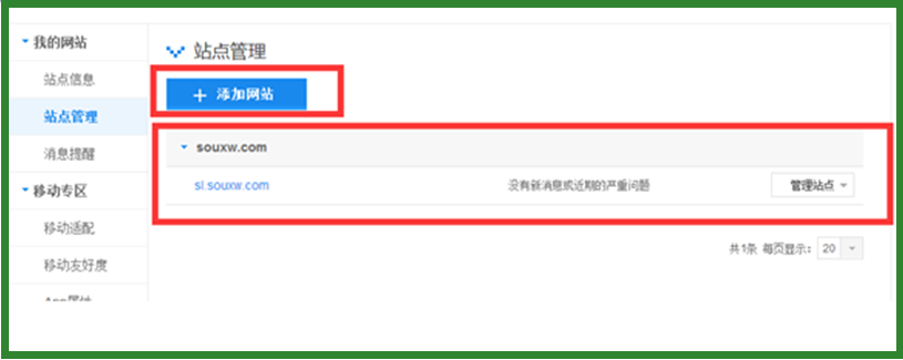 第四步:點擊左側站點管理,我們可以看到右側可以添加新網站,以及我們已經添加網站的近況。