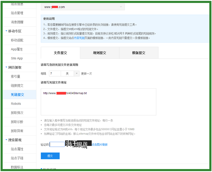 將瀏覽器地址: 提交百度站長工具 其中XXX代表域名,點擊左側死鏈提交,填寫更新時間,以及死鏈文件地址即可!