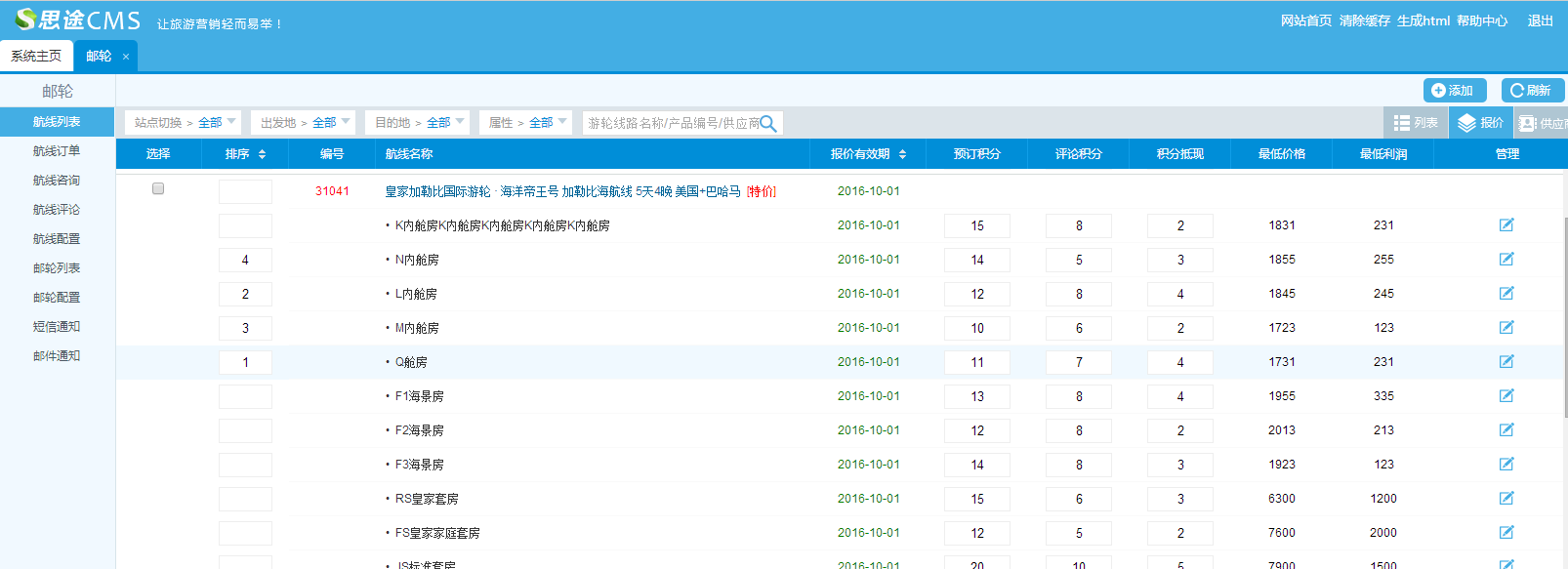 (4)報價列表:包含航線編號、航線名稱、最近報價有效期、預訂積分、評論積分、積分抵現、最低價格、最低利潤、以及管理