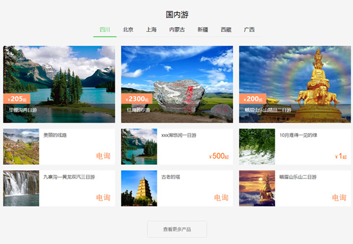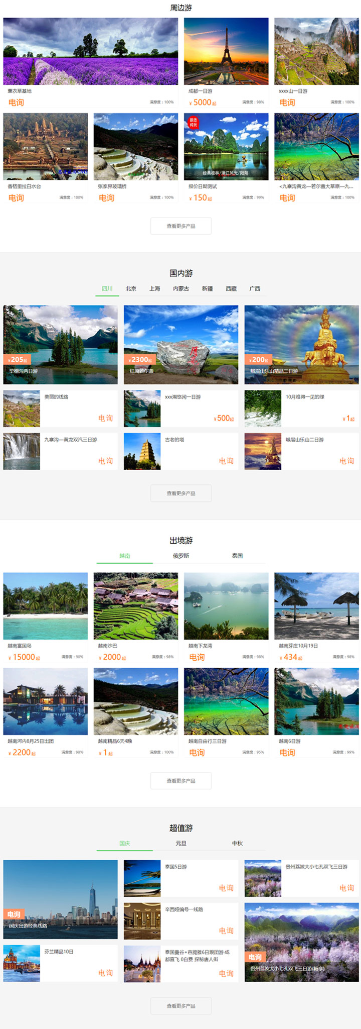 此模板是以線路為主的首頁模板,首頁共可設置四個線路板塊,以下圖為例共有周邊游、國內游、出境游和超值游: