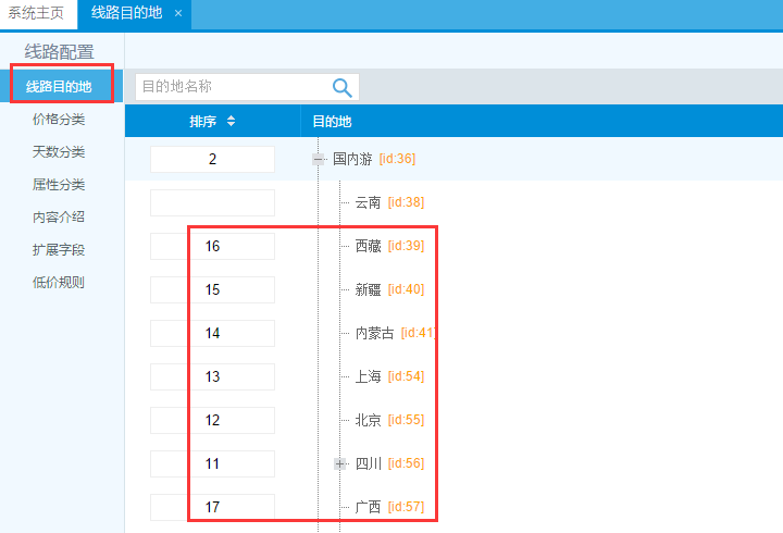 4、四個目的地版塊的排序,在線路目的地中找到四個大目的地,數字排序即可