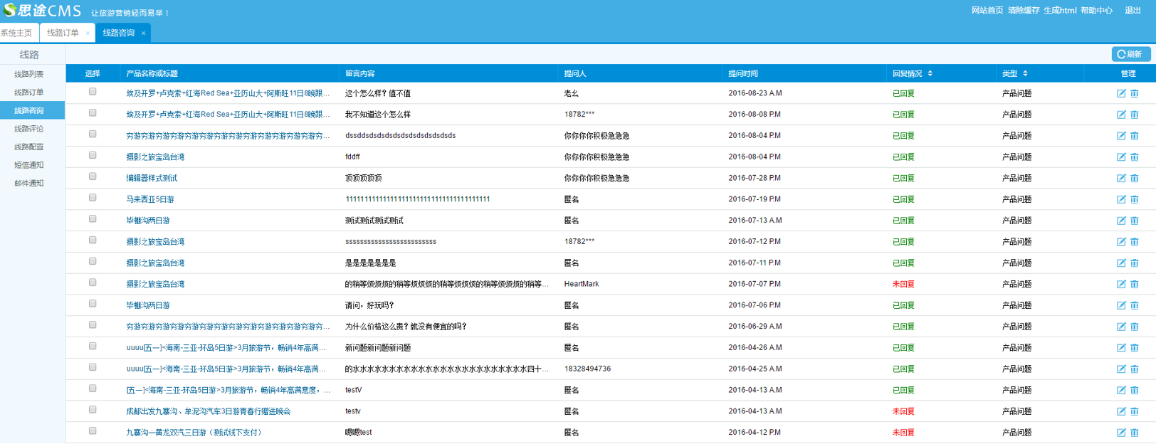 可以針對線路在前臺產品詳情頁進行咨詢的問題進行回復管理。