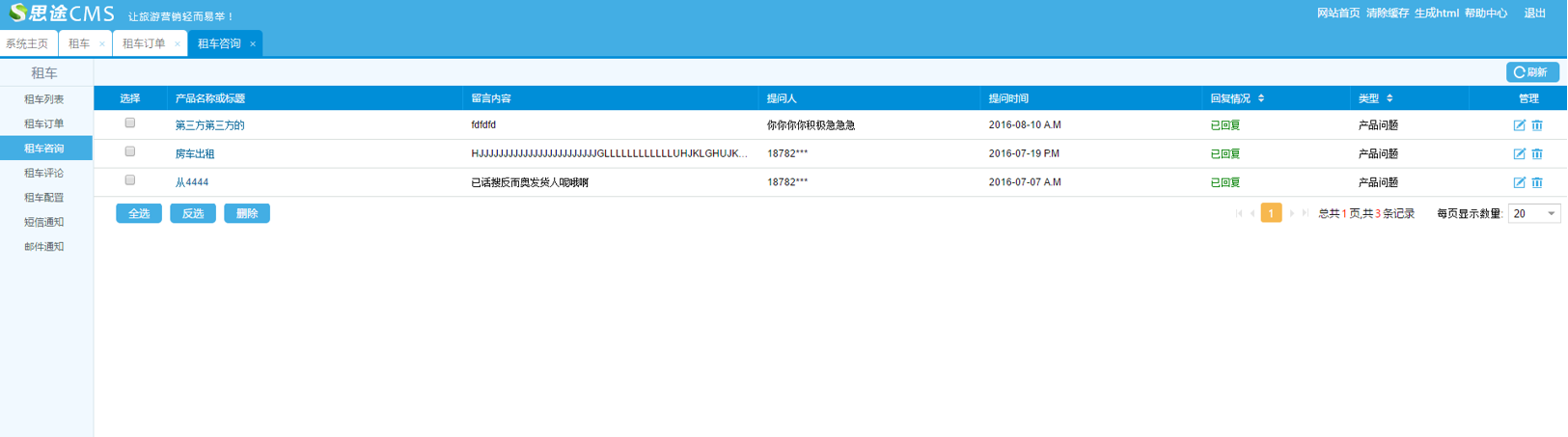 可以針對租車在前臺產品詳情頁進行咨詢的問題進行回復管理。