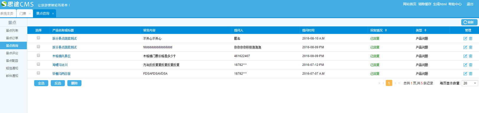 可以針對門票在前臺產品詳情頁進行咨詢的問題進行回復管理。
