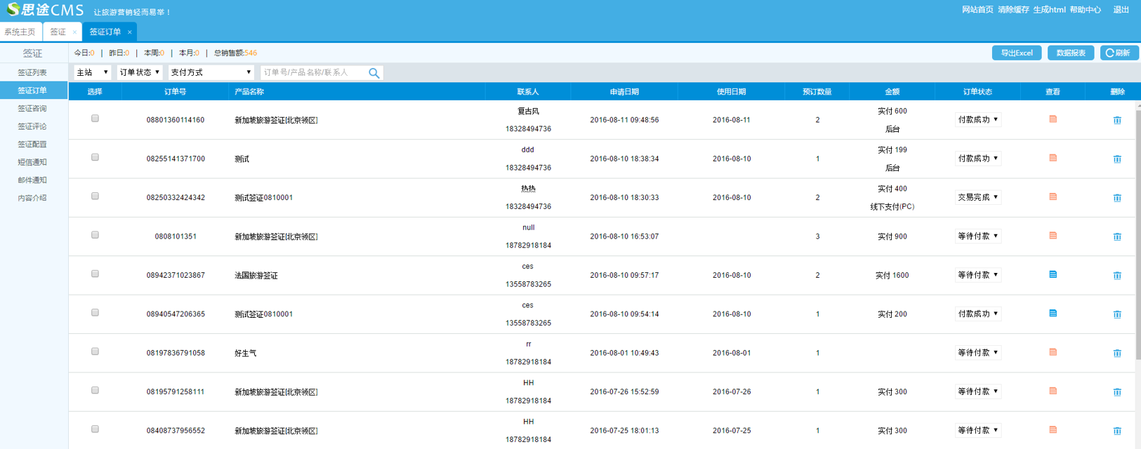 針對銷售的簽證產品訂單進行管理,可對訂單狀態進行修改,并支持多種支付方式設定。