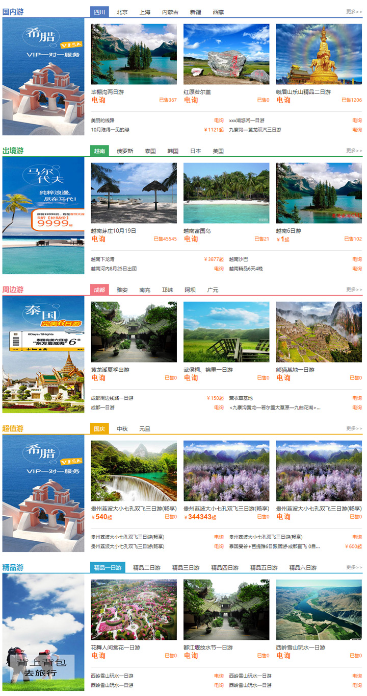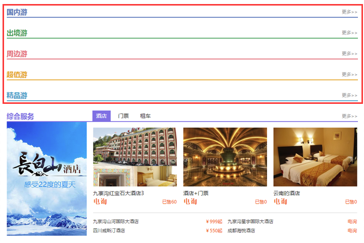 此模板是以線路為主的首頁模板,首頁共可設置五個線路板塊,以下圖為例共有國內游、出境游、周邊游、超值游和精品游: