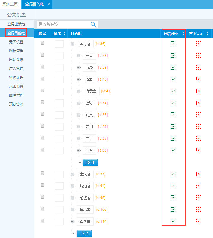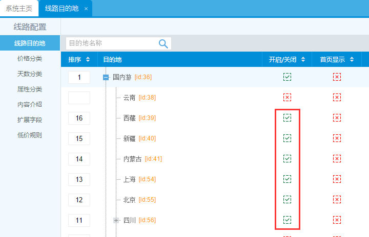 2、如果想把具體產品顯示出來,還需將線路目的地(國內游)的二級目的地開啟