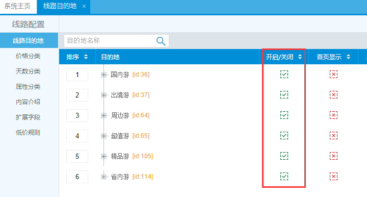 然后將線路目的地中的一級目的地開啟,前臺的大板塊就基本成型了