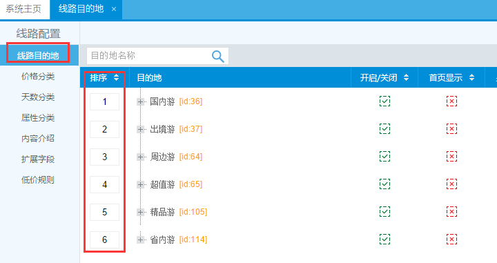 4、四個目的地版塊的排序,在線路目的地中找到四個大目的地,數字排序即可