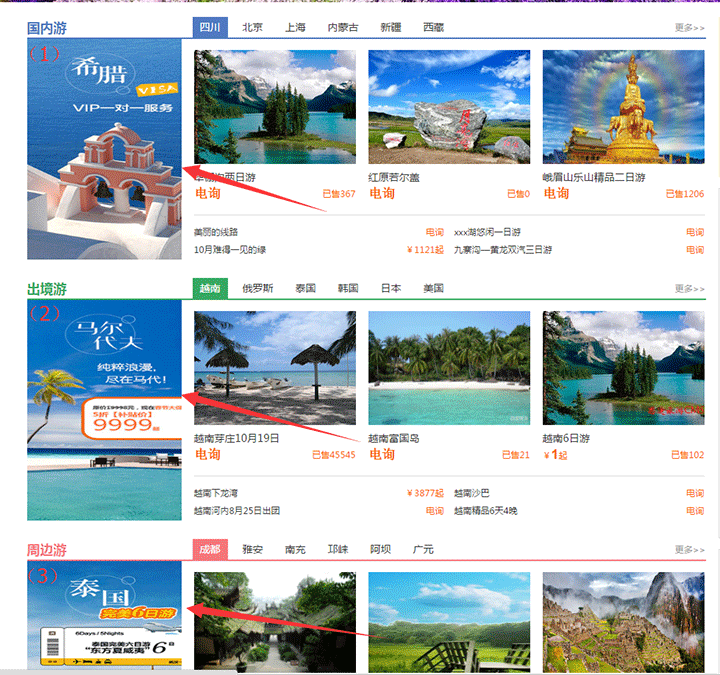 仿途牛門戶首頁模板,線路版塊最多可設置五個線路版塊(版塊設置可請參考//meihua-al.cn/help/605.html),這五個線路版塊的廣告位均有自己的獨立標識