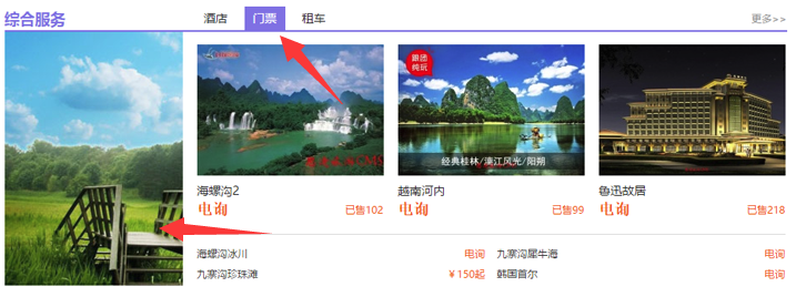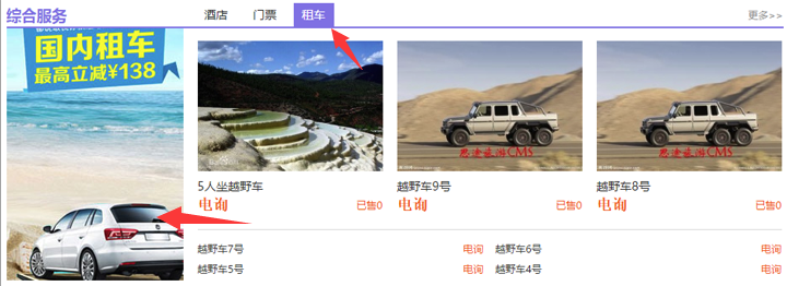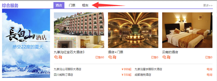 191號首頁模板的綜合服務版塊固定有3個欄目(酒店、門票和租車),鼠標放到哪個欄目下面就會顯示那個欄目的產品,并且廣告位也會隨著欄目改變,請看下圖: