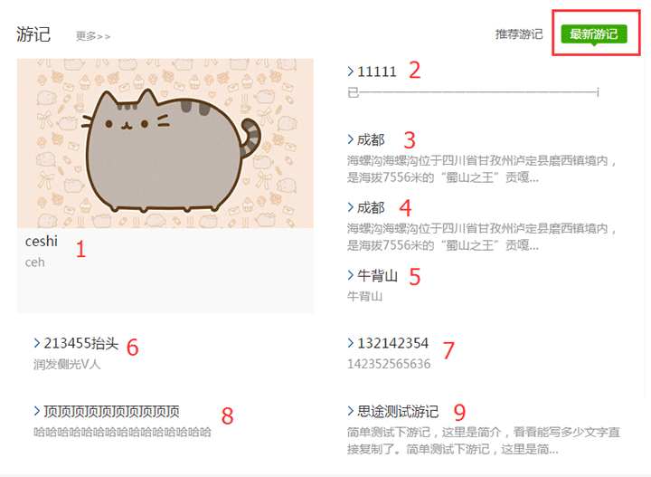 最新游記:首頁一共展示九篇最新游記,根據游記的發布時間先后順序系統自動進行排序,最新發的展示在最前面(展示順序請看截圖)。