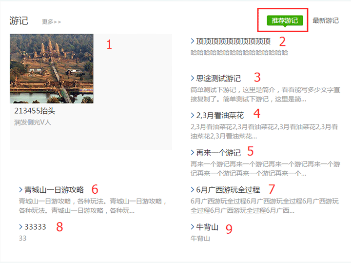游記板塊首頁分為:推薦游記和最新游記兩個部分展示。