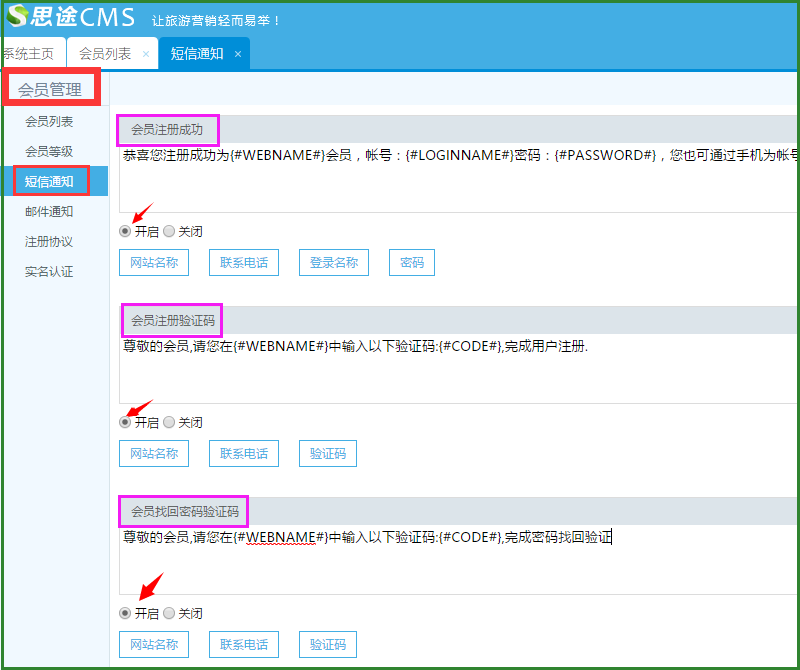 操作位置:用戶管理—會員管理—短信通知。開啟并配置、編輯內容以后,可以發送三種類型的通知
