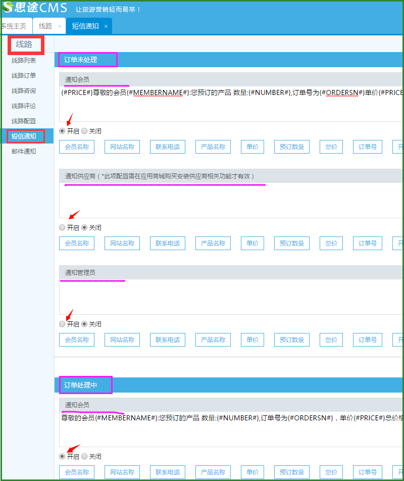 例如線路模塊,可以開啟4種訂單狀態的通知,也可以分別發送給會員、供應商、網站管理員(其中供應商需要購買安裝了相關應用才可以,網站管理員的手機號碼是在用戶管理-管理員管理 中,去設置手機號碼)