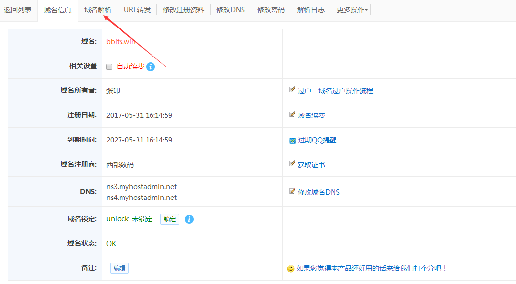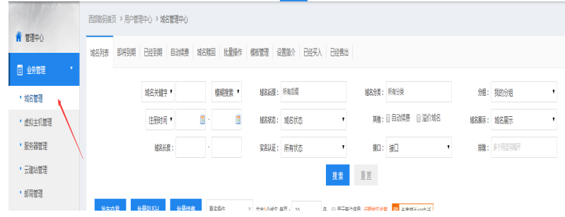 在購買域名的網站登陸注冊賬號和密碼,在左側的管理中心點擊域名找到購買的域名
