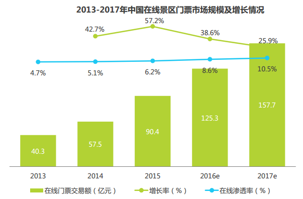2015年國內用戶短線休閑度假行為逐漸增多,形成了周邊游熱潮,而以門票為核心的周邊游產品將持續利好,隨著未來自駕游趨勢的發展,門票+住宿配套產品會更受用戶歡迎。2015年在線景區門票市場規模為90.4億元,增速高達57.2%,隨著互聯網的發展,依托“互聯網+”的智慧旅游平臺推廣,使互聯網在旅游產業中產生的影響力越來越大,景區門票仍是周邊游關鍵產品,市場份額將逐漸提升。