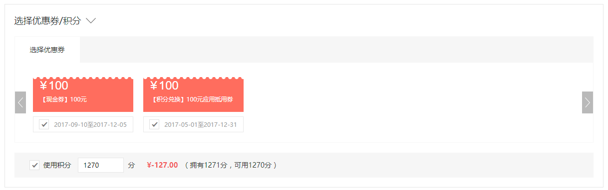 在個人中心內,可以使用現有積分兌換優惠券,兌換的優惠券可以在訂單支付時使用。也就是說,如果你的積分足夠多的話,就可以在一個訂單里面同時使用積分和優惠券來疊加抵扣啦!