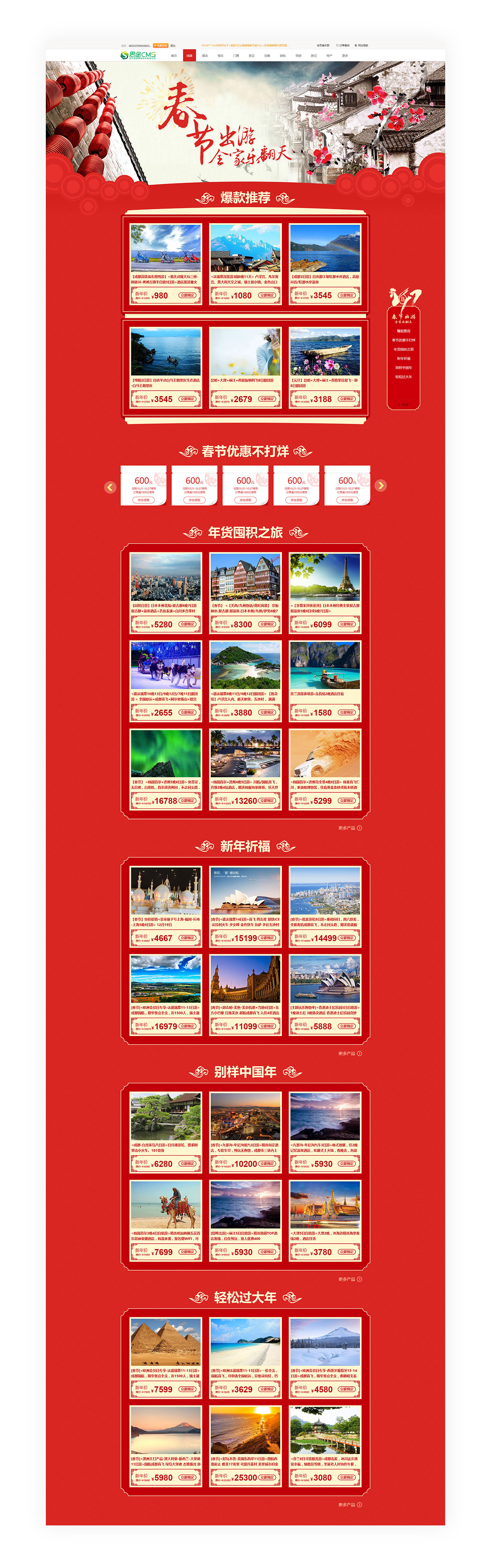 (專題頁)此模板以春節為主題,頁面具有強烈的節日氛圍和濃厚的傳統文化元素,如祥云,金雞,窗雕等,為游客營造出喜慶,熱鬧的春節氣息。此套春節模板以線路為主題,活動頁面可以展示豐富的旅游線路,配合網站營銷活動,具有較強的視覺沖擊力和產品吸引力。春節模板能為旅游網站提供良好的營銷效果,因其時效性較強,建議旅游網站提前購買,做好春節活動準備。*使用此模板需提前安裝全新專題應用(No.67)該模板不支持換膚。
